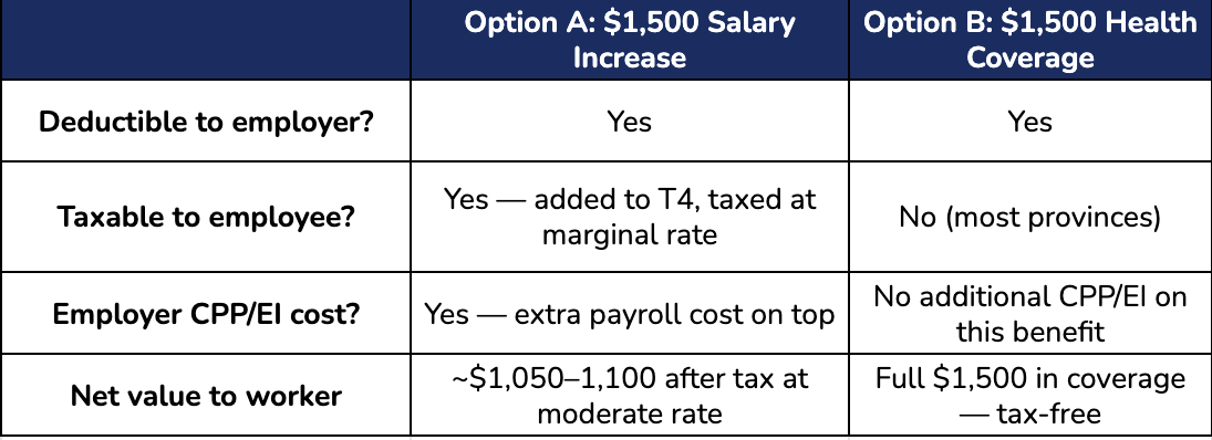 What makes health benefits especially powerful is the employee side of this equation. In most provinces, employer-paid health and dental premiums aren’t added to the employee’s taxable income, so workers receive coverage tax-free and typically won’t see it reported on their T4.